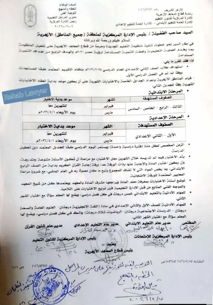 موعد امتحانات شهري فبراير ومارس 2026 للصفين الأول والثاني الإعدادي أزهر