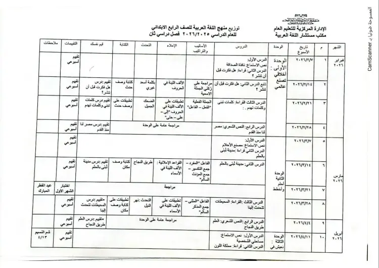 جاء توزيع منهج اللغة العربية رابعة ابتدائي الترم الثاني 2026 على النحو التالي: