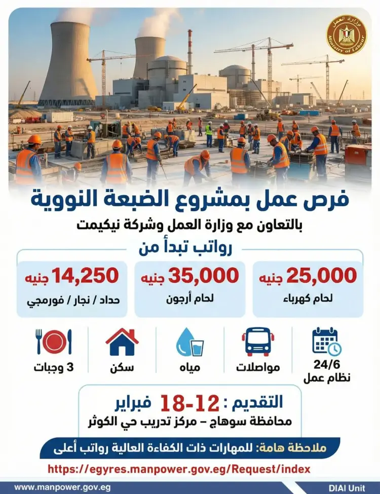 بدء التقديم على فرص عمل بمشروع الضبعة النووية بمحافظة سوهاج