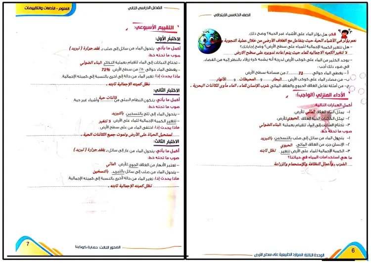 حل الواجب المنزلي والأداء الصفي وتقييم الأسبوع الأول علوم الصف الخامس الابتدائي الترم الثاني 2026