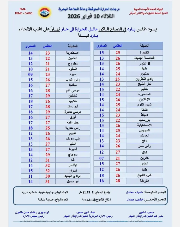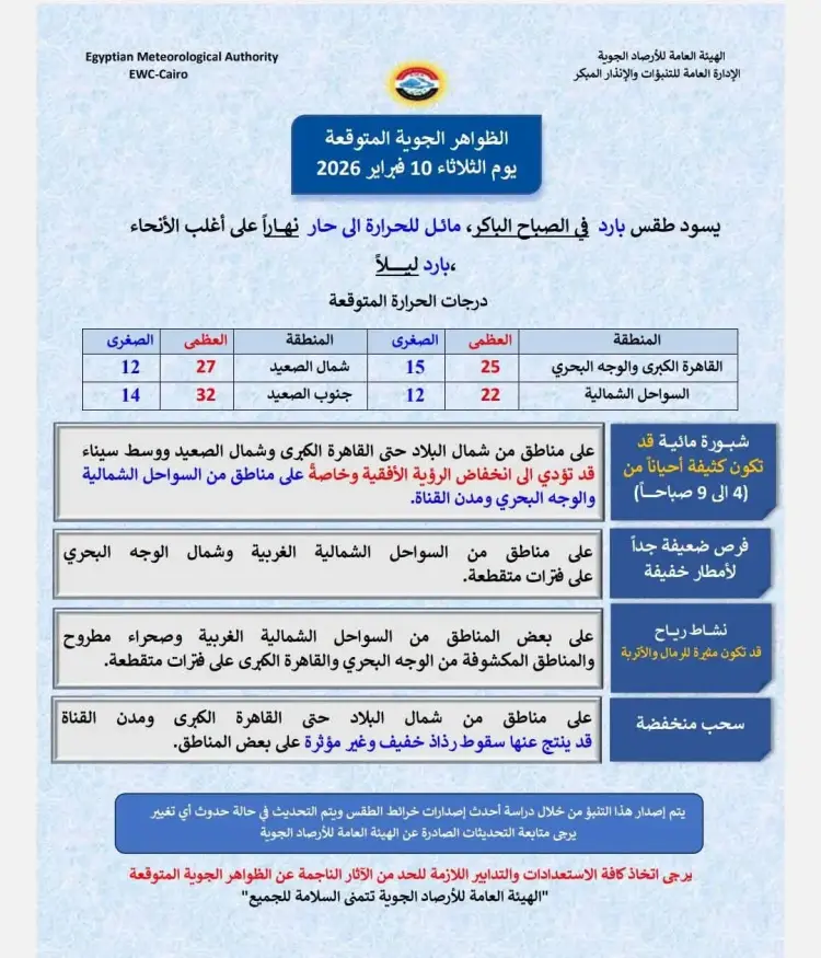 كشفت الهيئة العامة للأرصاد الجوية عن توقعات الطقس غدا الثلاثاء الموافق 10 فبراير 2026، حيث تشهد البلاد تبايناً في درجات الحرارة بين النهار والليل، مع ظهور مجموعة من الظواهر الجوية التي تستوجب الحذر من قبل المواطنين وسائقي المركبات.