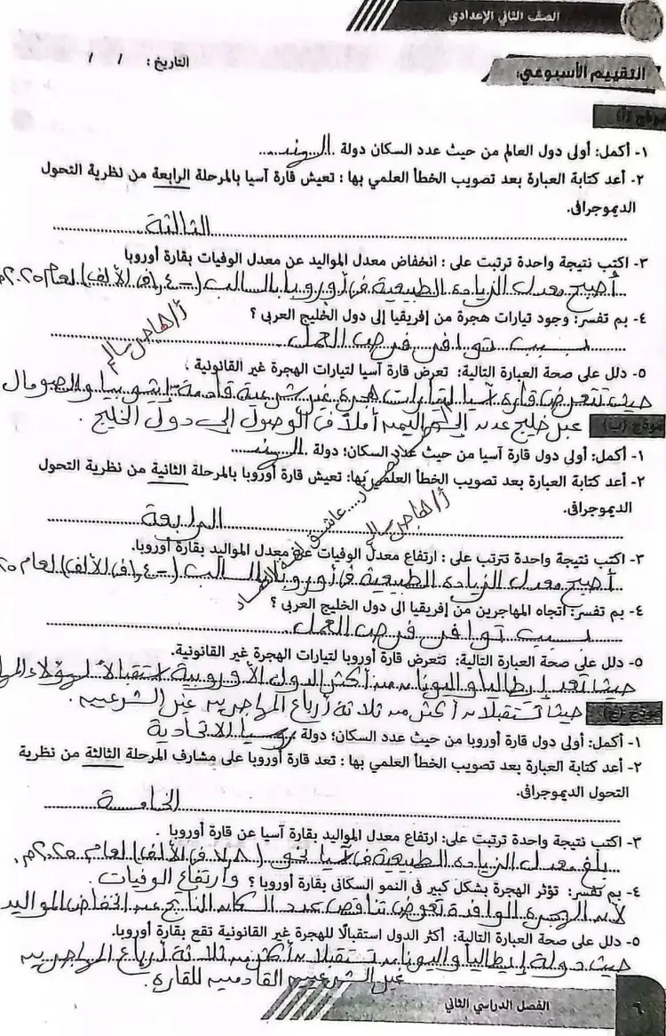 حل الواجب المنزلي والأداء الصفي وتقييم الأسبوع الأول دراسات الصف الثاني الإعدادي الترم الثاني 2026