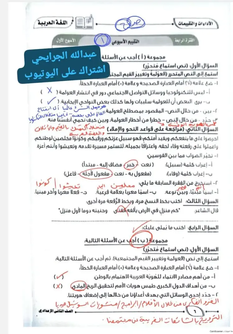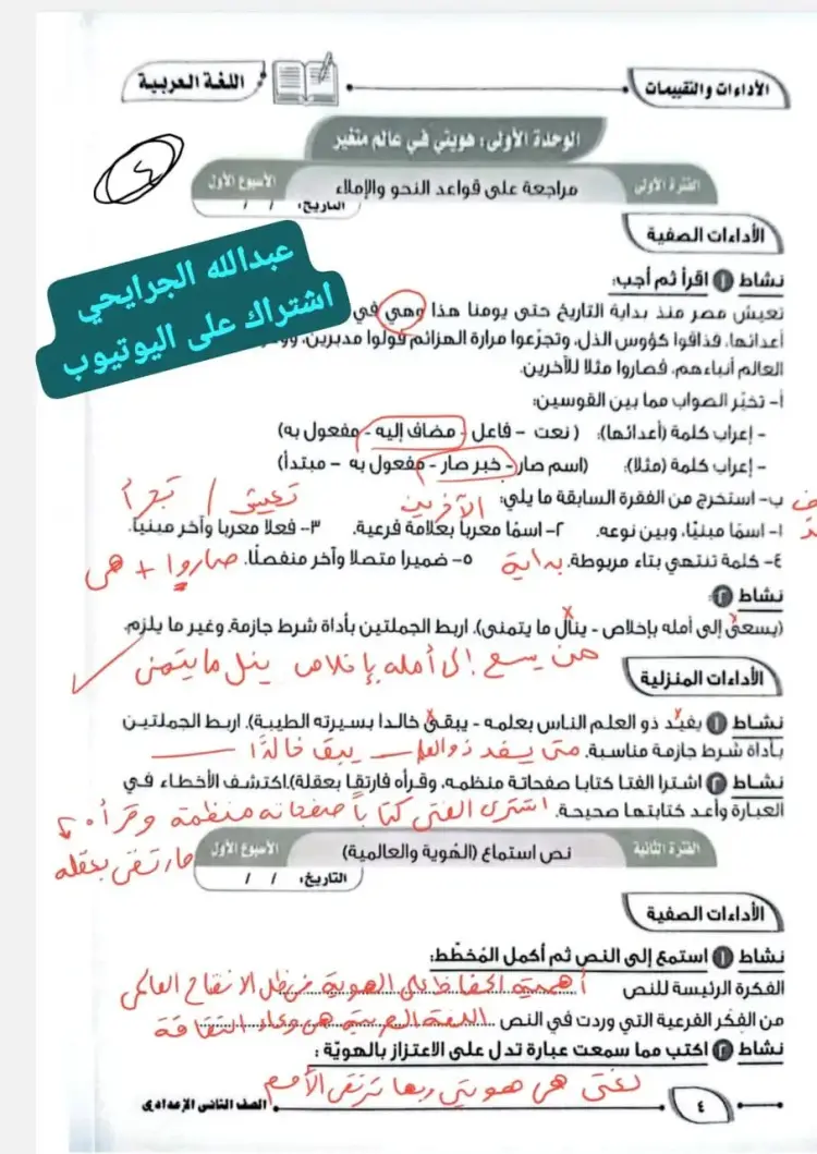 حل الواجب المنزلي والأداء الصفي وتقييم الأسبوع الأول عربي الصف الثاني الإعدادي الترم الثاني 2026