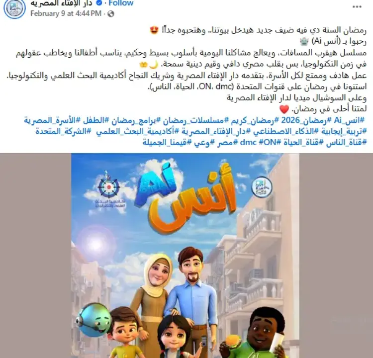 أعلنت الصفحة الرسمية لدار الإفتاء المصرية عن مسلسل الرسوم المتحركة، أنس AI، المقرر عرضه على الشاشات ضمن قائمة مسلسلات رمضان 2026.