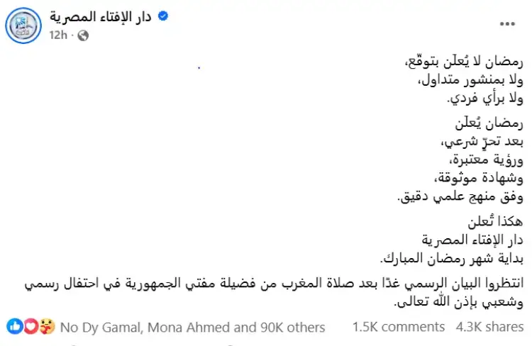 أكدت دار الإفتاء المصرية في بيان رسمي عبر صفحتها لرسمية على الفيسبوك أن إعلان بداية شهر رمضان لا يتم بناءً على تقديرات فلكية أو منشورات على الإنترنت، وإنما يُعلن رسميًا بعد تحرّي رؤية هلال الشهر الجديد شرعيًا من خلال لجان متخصّصة تعمل وفق معايير علمية وضوابط شرعية معتمدة.