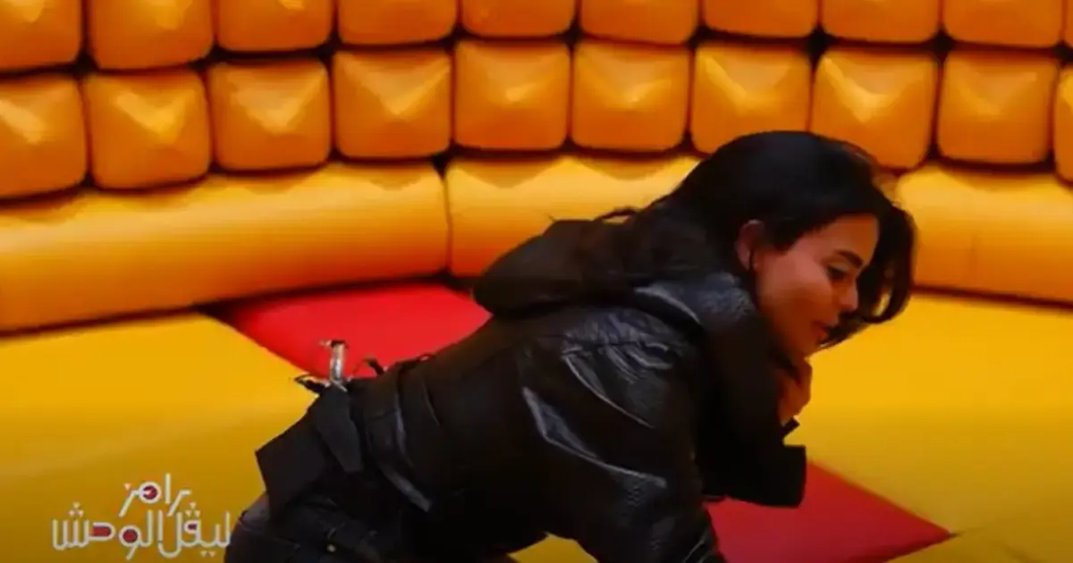 وجدت الضيفة نفسها مضطرة للتشبث بعصا تتدلى من السقف لحماية نفسها من السقوط، وفي هذه الأثناء كان رامز جلال يوجه لها الأسئلة ويرشها بمادة سائلة لزجة.