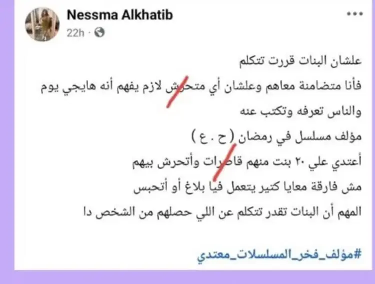 بحسب ما نشرته وسائل إعلام عربية، فإن حسن علي هو اسم المؤلف المرتبط بالعمل، وقد تصدّر اسمه الترند بعد انتشار الهاشتاغ والتعليقات، لكن حتى الآن لا توجد إدانة قضائية رسمية في القضية، والأمر ما زال تحت التحقيق والتدقيق من قِبل الجهة المنتجة والجهات المختصة.