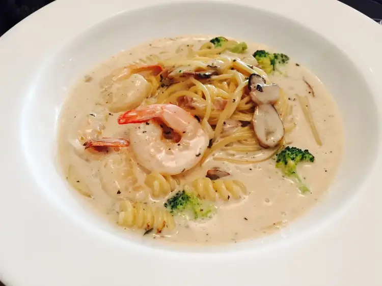 جمبري سوتيه بالثوم والزبدة (بروتين) + باستا قمح كامل بزيت الزيتون (نشويات) + سلطة خس وذرة (خضار) + عصير جوافة طازج.