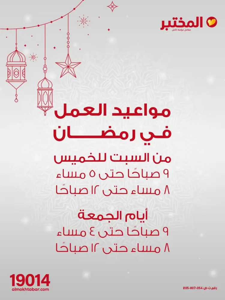 مواعيد المختبر في رمضان 2026 قبل وبعد الإفطار بجميع الفروع