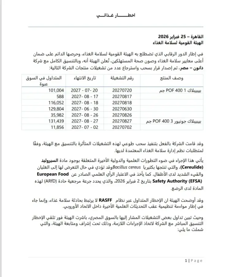وأوضح البيان أن القرار يشمل سبع تشغيلات من منتجات «بيبيلاك 1 POF 400 جم» و«بيبيلاك جونيور 3 POF 400 جم»، بإجمالي كميات متداولة بلغت 526,725 عبوة طرحت في الأسواق بتواريخ انتهاء مختلفة خلال عام 2027.