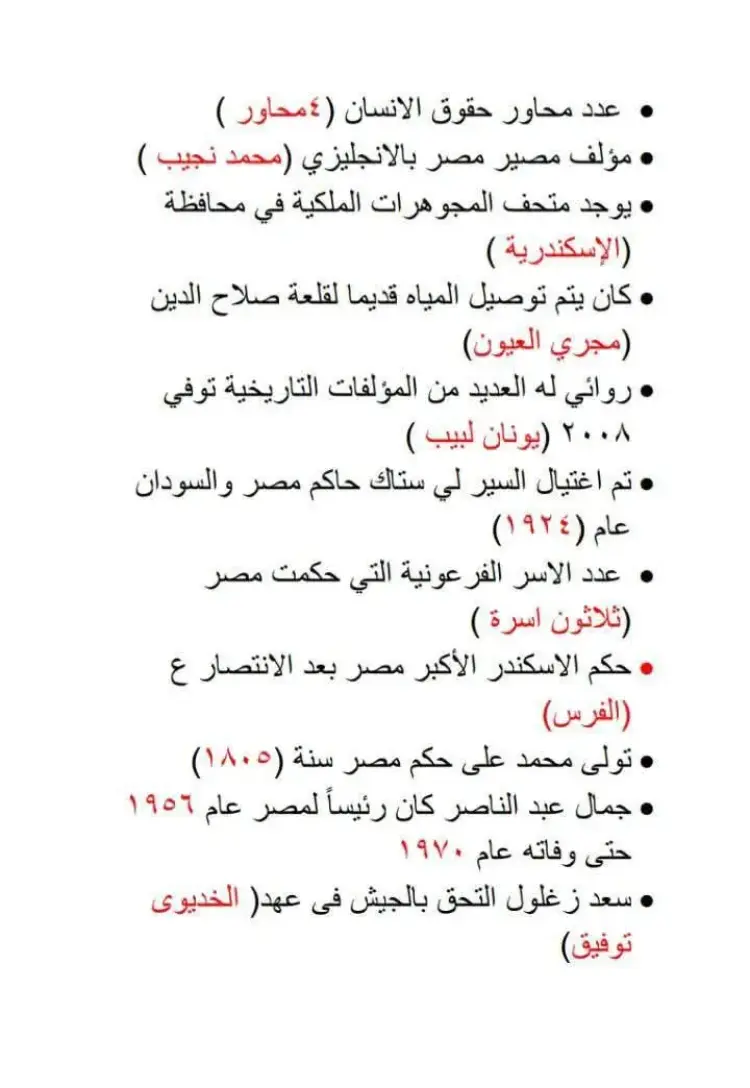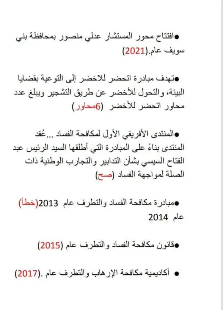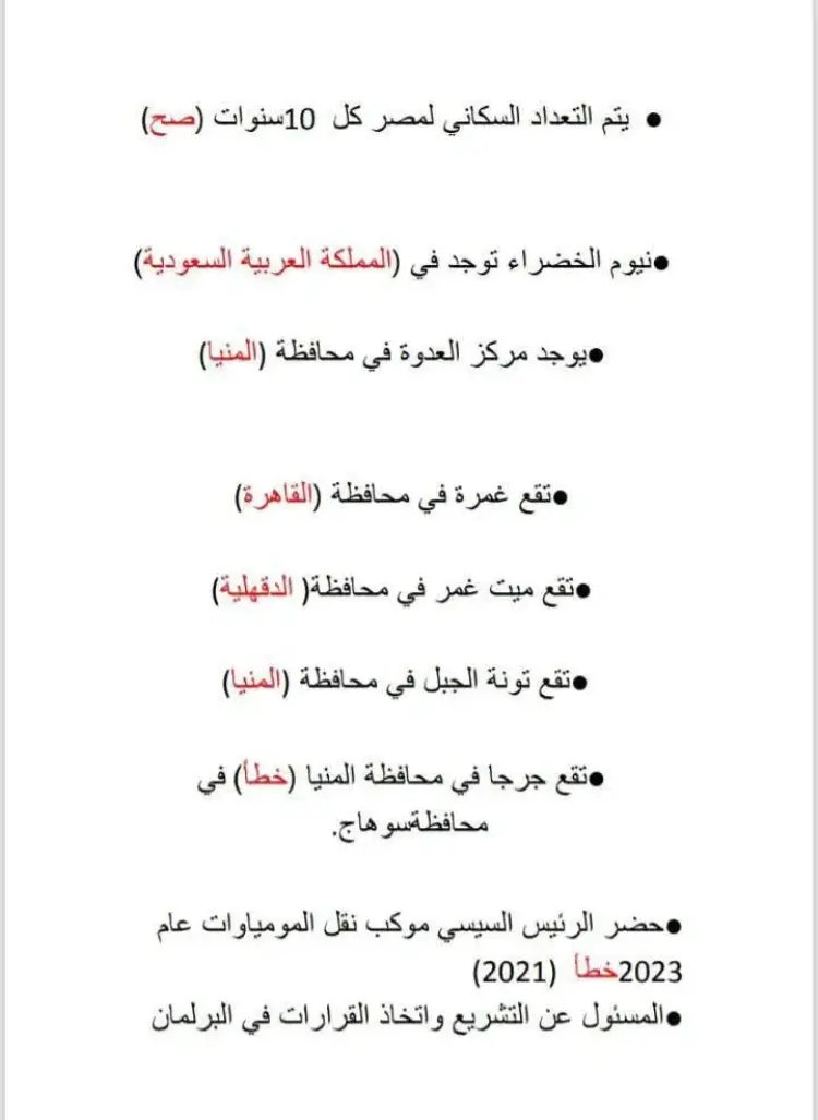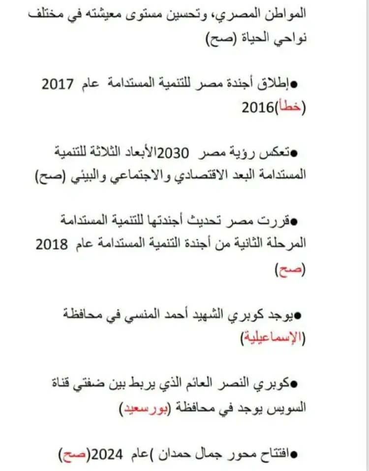 تتضمن الاختبارات أسئلة حول دور مصر الريادي وعلاقاتها الدولية، ومنها:
