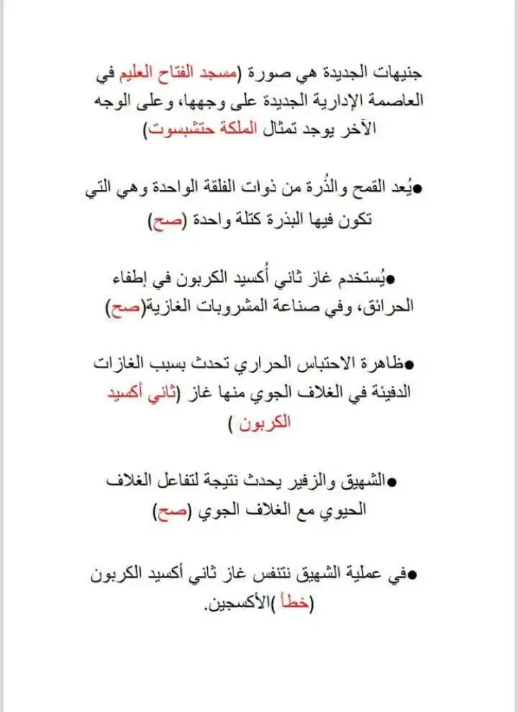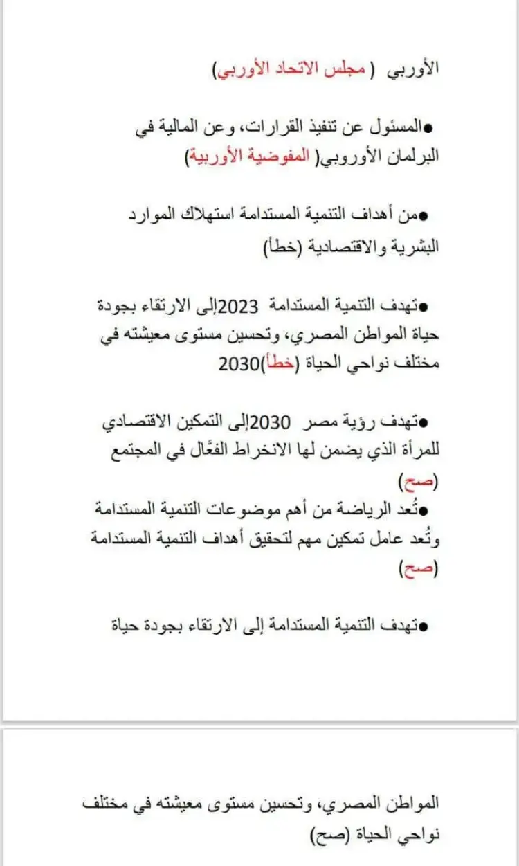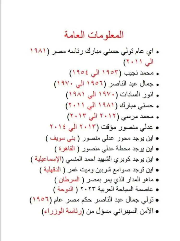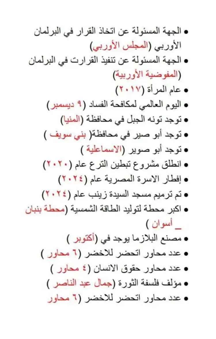 تتضمن الاختبارات أسئلة حول دور مصر الريادي وعلاقاتها الدولية، ومنها: