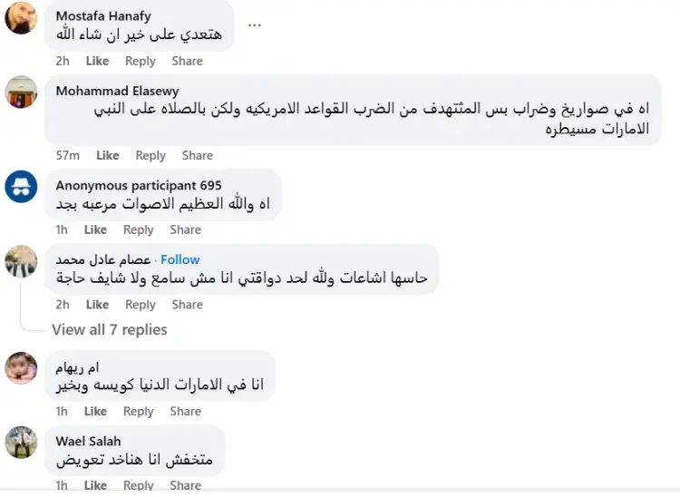 وأكد العديد من هؤلاء أنهم يمارسون حياتهم اليومية بشكل طبيعي، وأنهم لم يلمسوا أي تأثير واضح من الأحداث العسكرية، وقال البعض «مفيش أي حاجة في الإمارات هو في أبو ظبي بس صوت ضرب لكن باقي الإمارات مفيش حاجة»، أخرون قالوا: «حساها إشاعات والله لحد دلوقتي أنا مش سامع ولا شايف حاجة»، وقالت إحدى المتابعين: «أنا في الإمارات الدنيا كويسة وبخير»