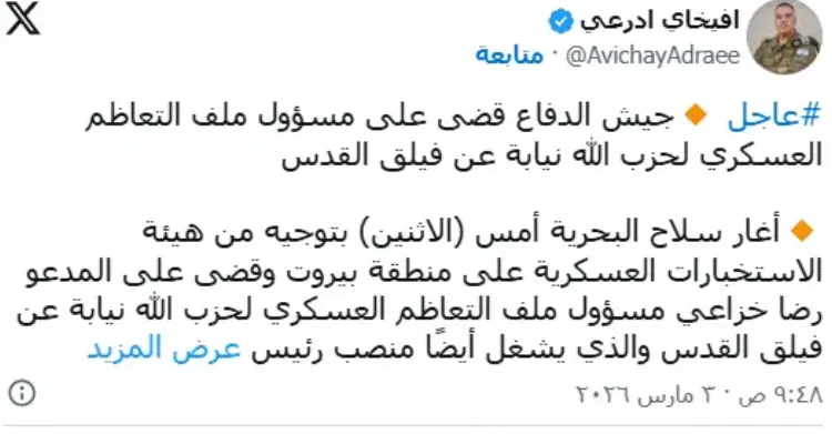وتقول إسرائيل إنه كان مسؤولاً عن مواءمة احتياجات الحزب التسليحية مع الموارد والدعم الذي توفره طهران، إضافة إلى الإشراف على خطط إدخال أسلحة ومعدات عسكرية إلى لبنان.