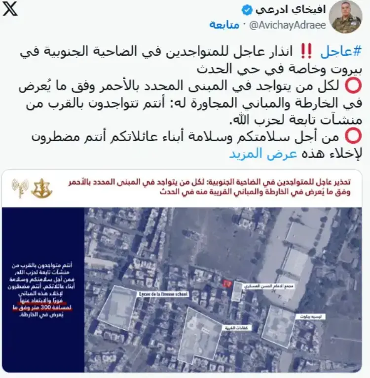 كما واصل الجيش الإسرائيلي غاراته على الضاحية الجنوبية لبيروت، حيث استهدفت إحداها مبنى إذاعة «النور» التابعة لحزب الله، بعد توجيه إنذارات بإخلاء مناطق في حارة حريك والغبيري.
