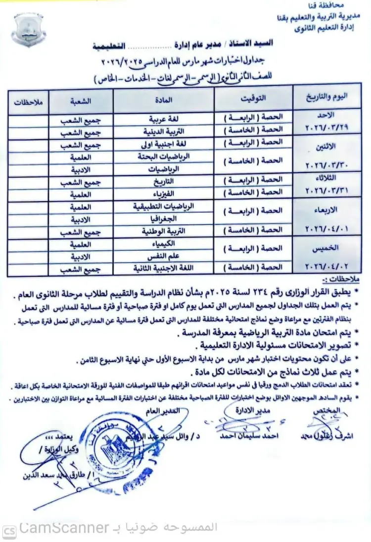 جدول امتحانات شهر مارس تانية ثانوي 2026 بمحافظة قنا (علمي وأدبي)