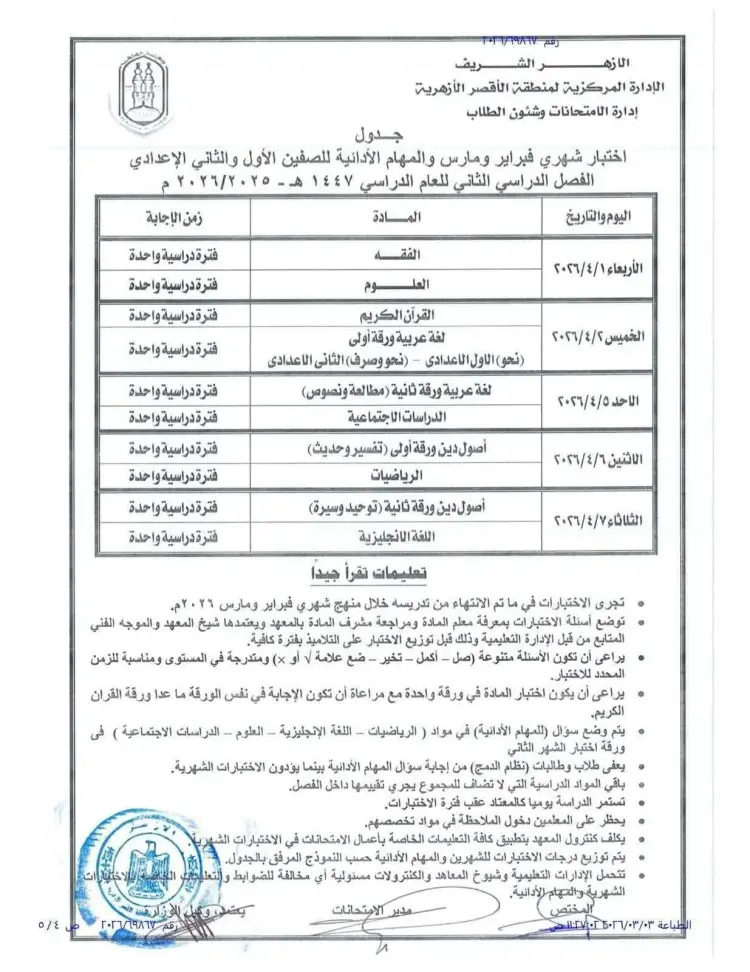جدول امتحانات شهري مارس وفبراير لأولى وتانية إعدادي أزهر 2026