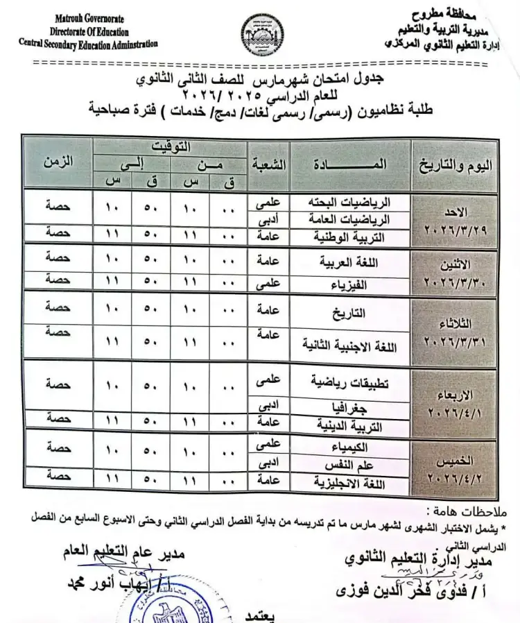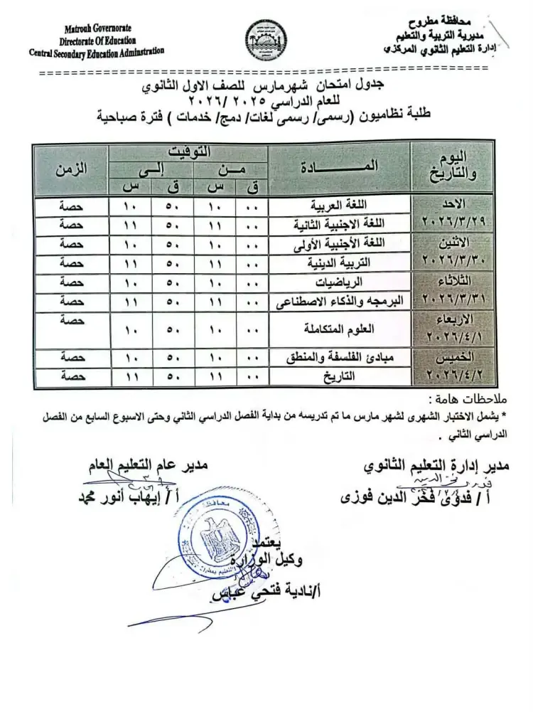 جدول امتحانات شهر مارس 2026 للصفين الأول والثاني الثانوي محافظة مطروح