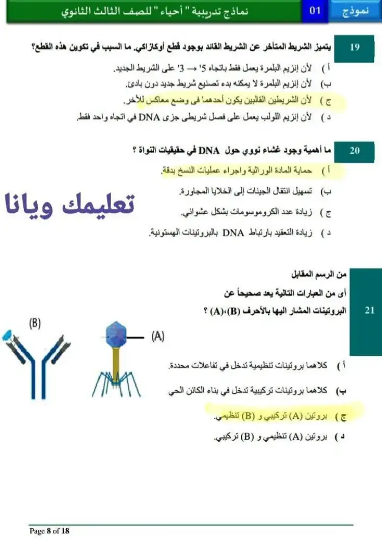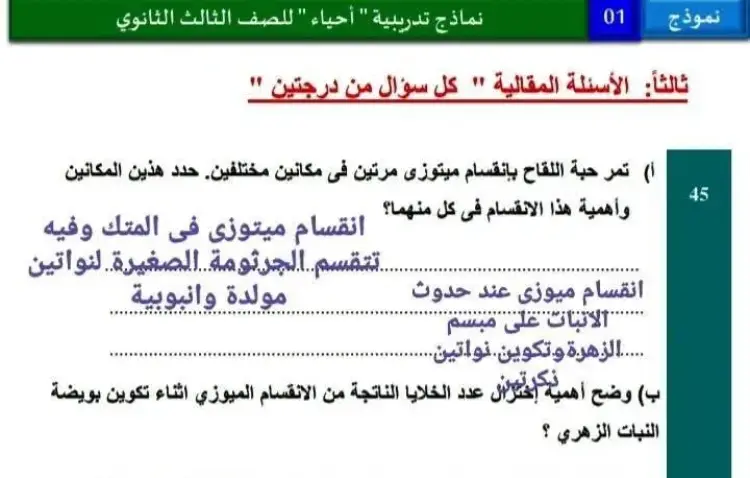 يتضمن حل النموذج الاسترشادي أحياء للصف الثالث الثانوي 2026 النموذج الأول مجموعة من الأسئلة التي قام المدرسون بالإجابة عنها وشرحها، ومن بين أبرز الأسئلة والإجابات التي وردت في النموذج ما يلي: