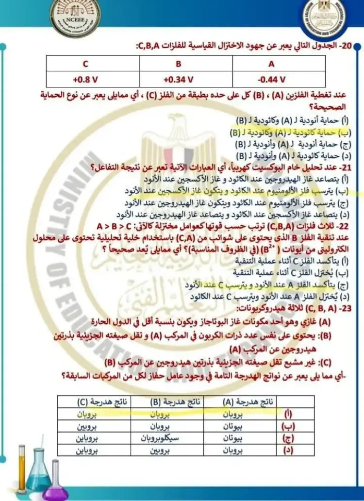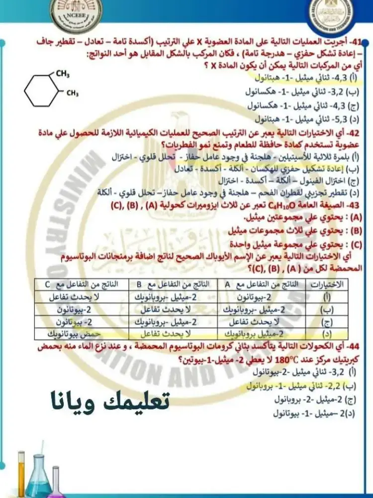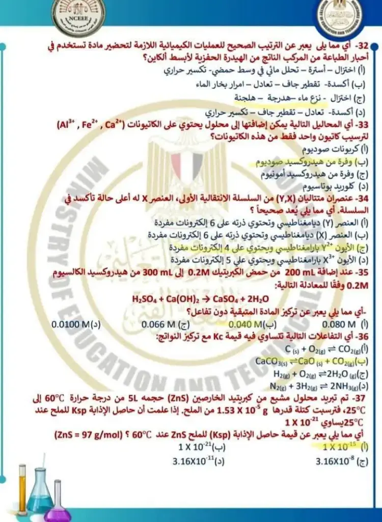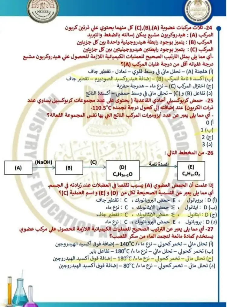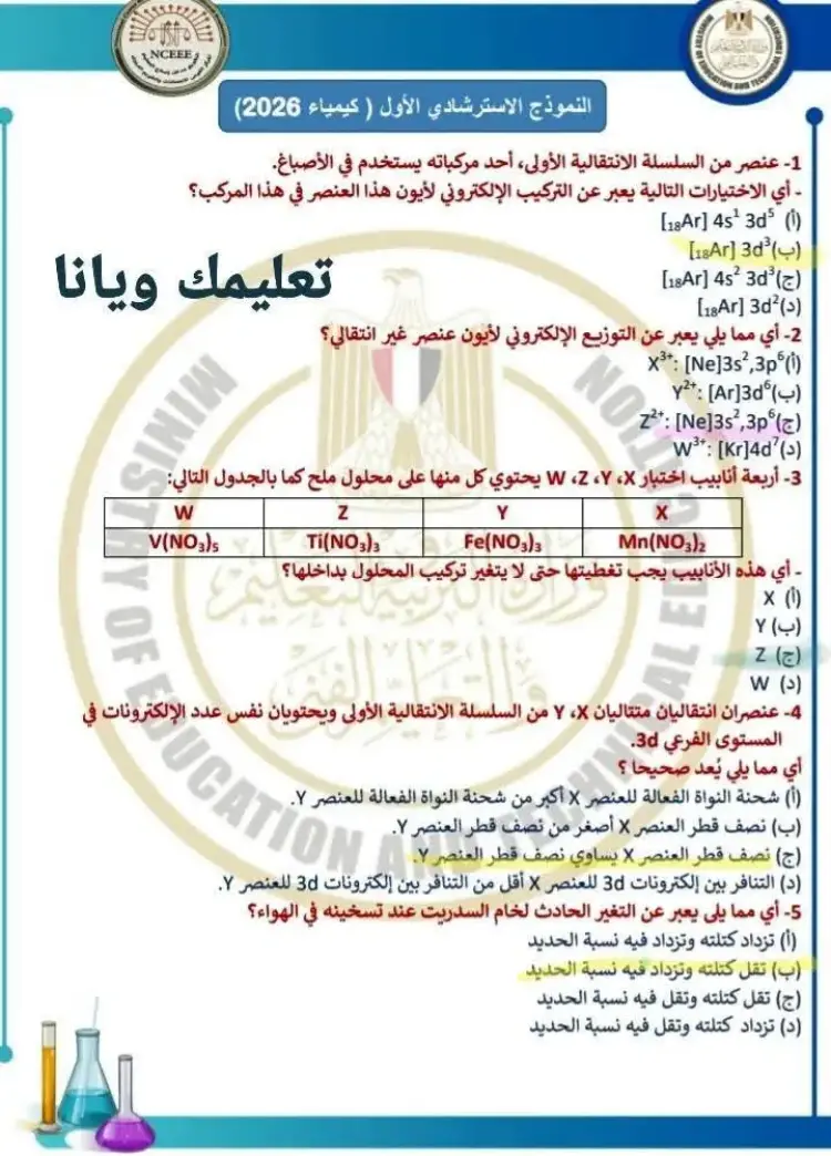 يتضمن حل نموذج الامتحان الاسترشادي كيمياء للصف الثالث الثانوي 2026 النموذج الأول مجموعة من الأسئلة التي قام المدرسون بحلها وشرح إجاباتها، وجاء من بين أبرز الأسئلة والإجابات الموجودة في النموذج ما يلي: