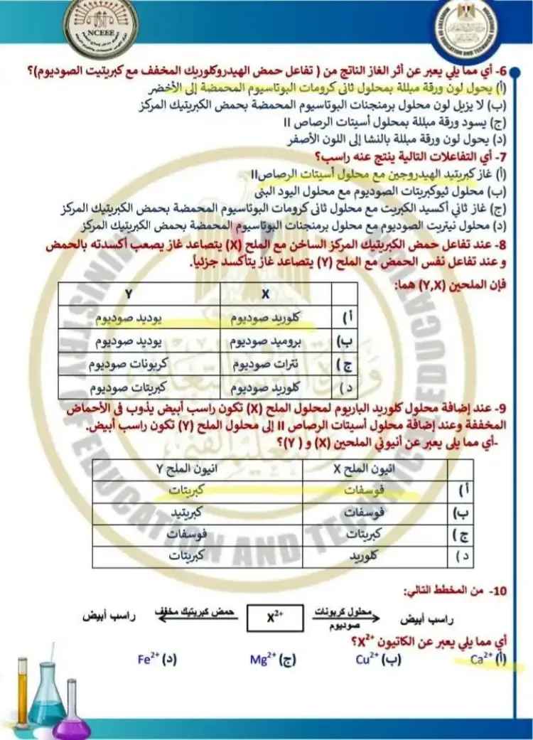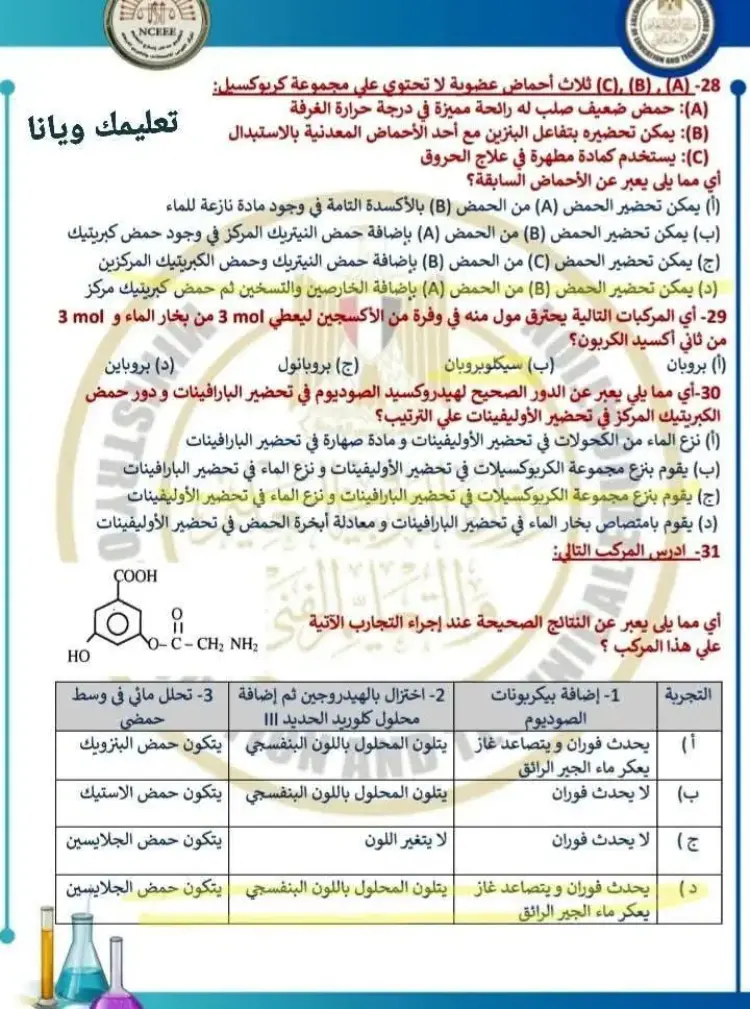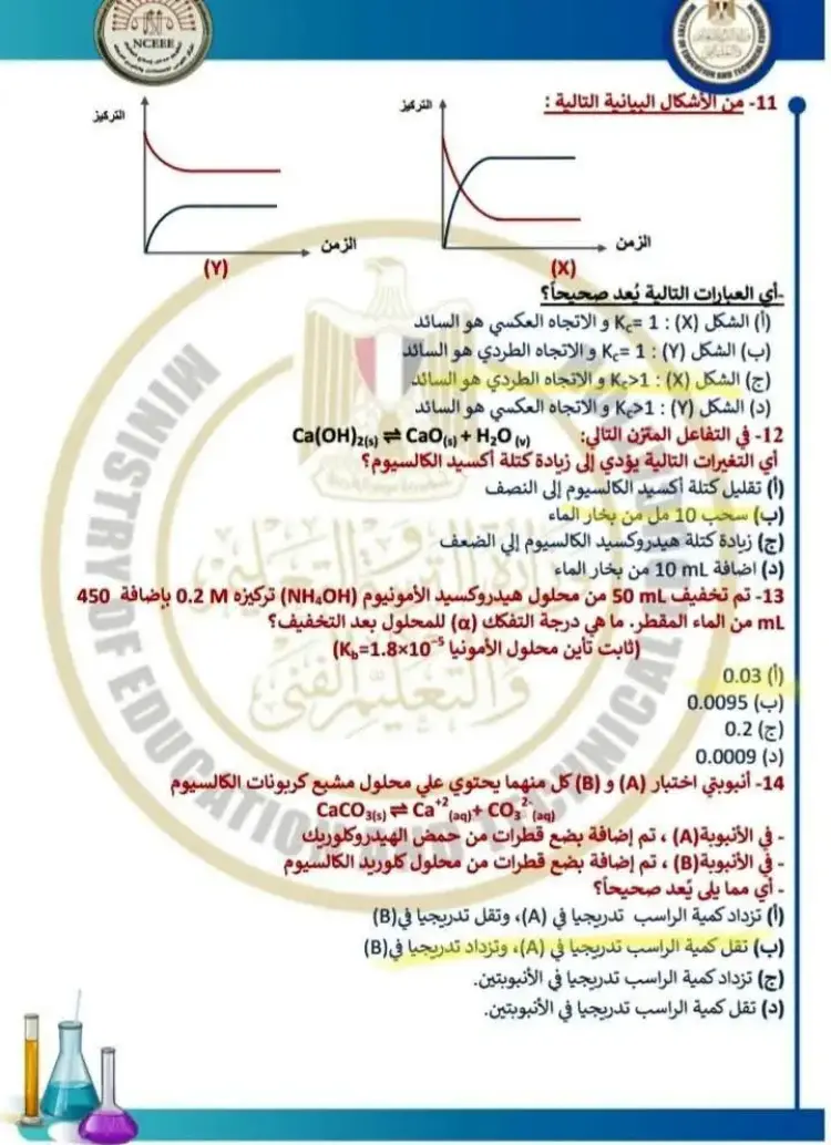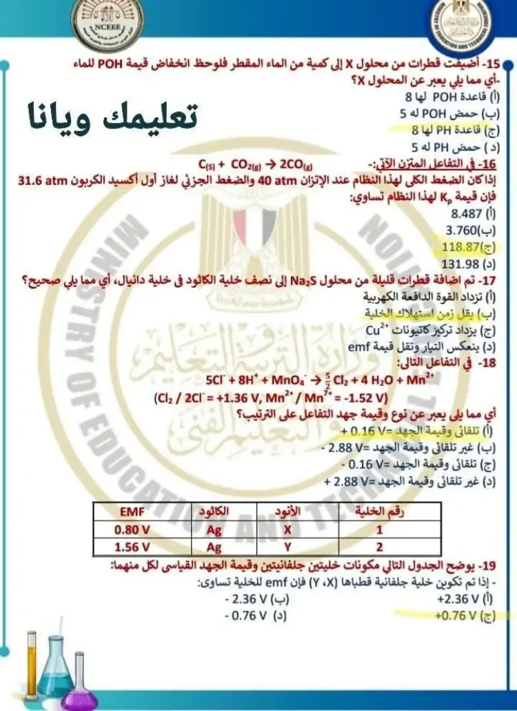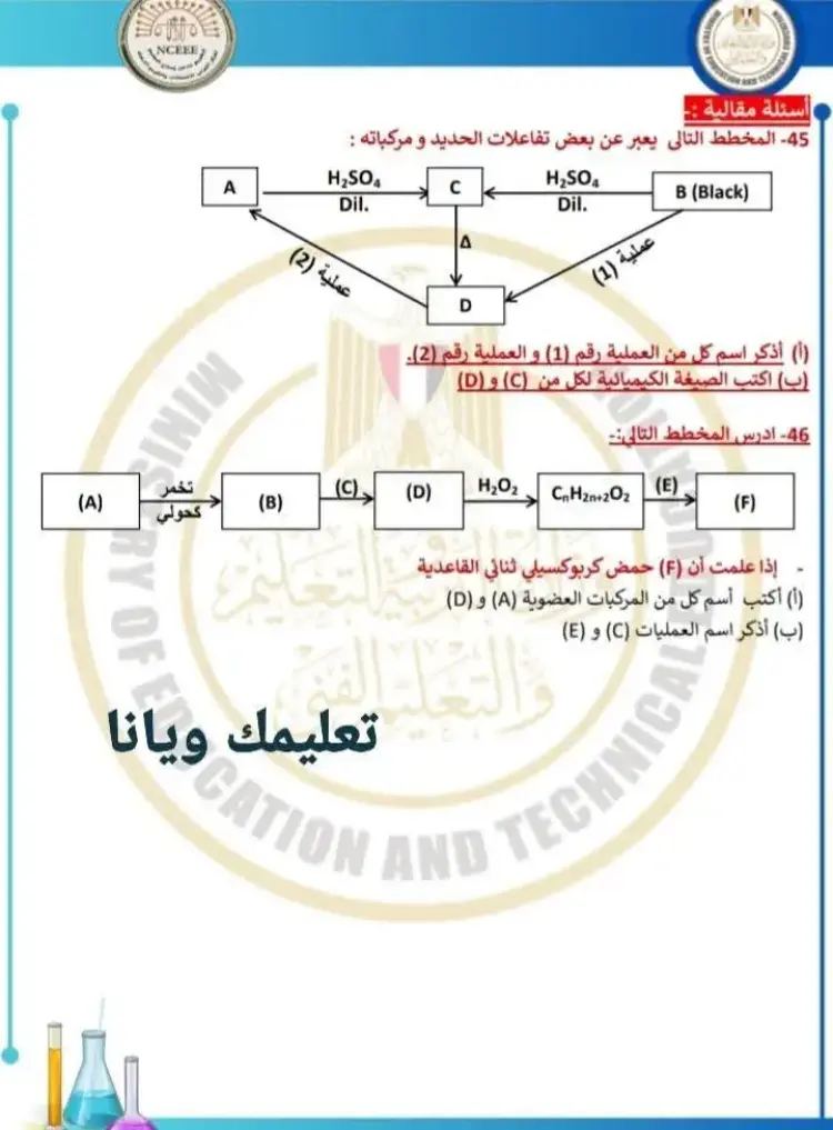 يتضمن حل نموذج الامتحان الاسترشادي كيمياء للصف الثالث الثانوي 2026 النموذج الأول مجموعة من الأسئلة التي قام المدرسون بحلها وشرح إجاباتها، وجاء من بين أبرز الأسئلة والإجابات الموجودة في النموذج ما يلي: