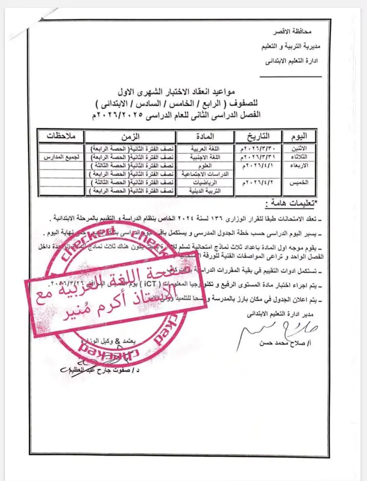 جدول امتحانات شهر مارس للصفوف الرابع والخامس والسادس الابتدائي محافظة الأقصر 2026