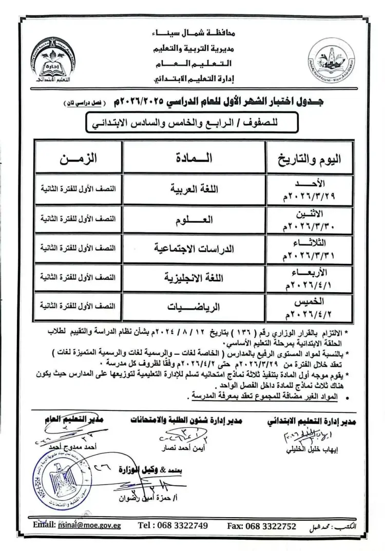 جدول امتحانات شهر مارس للصفوف الرابع والخامس والسادس الابتدائي محافظة شمال سيناء 2026