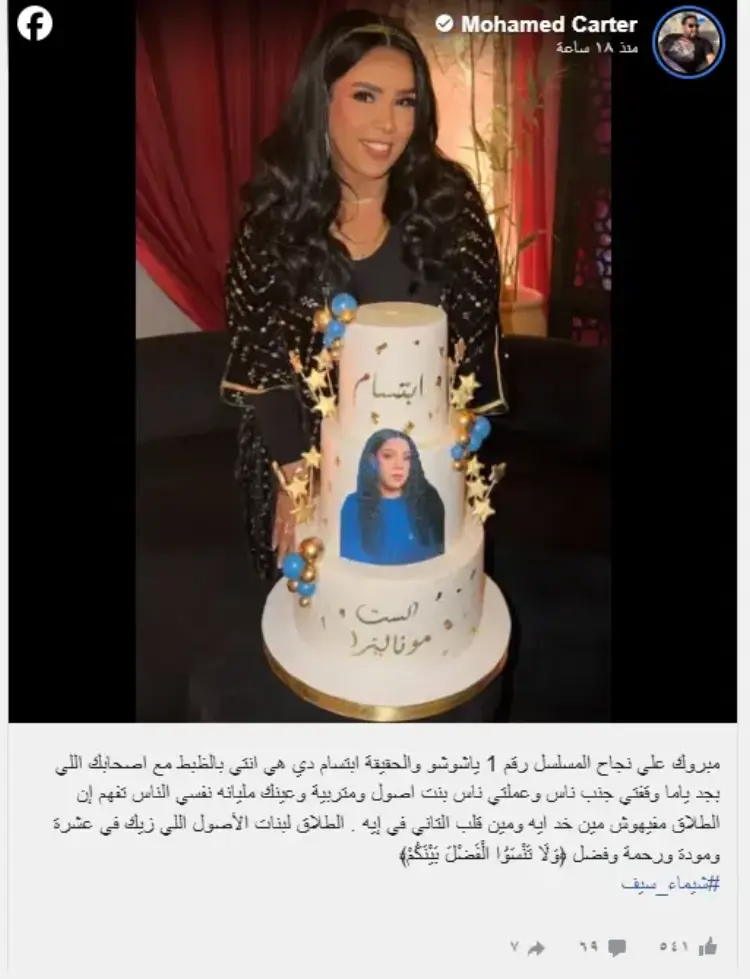 نشر المنتج محمد كارتر بوست مطولا عبر صفحته الشخصية، أوضح فيه أن شخصية ابتسام التي تقدمها شيماء في مسلسلها الأخير هي انعكاس حقيقي لمعدنها الأصيل مع أصدقائها، ووجه لها التهنئة قائلا: «مبروك على نجاح المسلسل رقم 1 يا شوشو»، مما أثار موجة من التعليقات التي أشادت برقي العلاقة بينهما واستمرار الود.