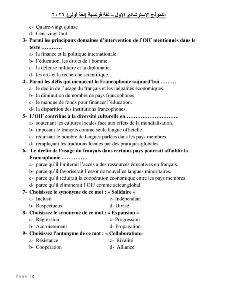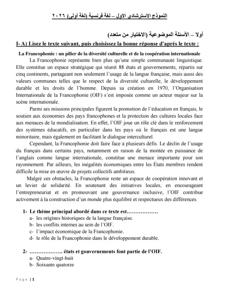 النموذج الاسترشادي الاول - لغة فرنسية (لغة أولى) ٢٠٢٦ أولا - الأسئلة الموضوعية (الاختيار من متعدد) I- A) Lisez le texte suivant, puis choisissez la bonne réponse d'après le texte : La Francophonie : un pilier de la diversité culturelle et de la coopération internationale La Francophonie représente bien plus qu'une simple communauté linguistique. Elle constitue un espace stratégique qui réunit 88 états et gouvernements, répartis sur cinq continents, partageant non seulement l'usage de la langue française, mais aussi des valeurs communes telles que le respect de la diversité culturelle, le développement durable et les droits de l'homme. Depuis sa création en 1970, l'Organisation Internationale de la Francophonie (OIF) s'est imposée comme un actor majeur sur la scène internationale. Parmi ses missions principales figurent la promotion de l'éducation en français, le soutien aux économies des pays francophones et la protection des cultures locales face aux menaces de la mondialisation. En effet, l'OIF joue un rôle clé dans le renforcement des systèmes éducatifs, en particulier dans les pays où le français est une langue minoritaire, mais également en facilitant le dialogue interculturel. Cependant, la Francophonie doit faire face à plusieurs défis. Le déclin de l'usage du français dans certains pays, notamment en raison de la montée en puissance de l'anglais comme langue internationale, constitue une menace importante pour son rayonnement. Par ailleurs, les inégalités économiques entre les États membres rendent difficile la mise en œuvre de projets collectifs ambitieux. Malgré ces obstacles, la Francophonie reste un espace de coopération innovant et un levier de solidarité. En soutenant des initiatives locales, en encourageant l'entrepreneuriat et en promouvant une gouvernance inclusive, l'OIF contribue activement à la construction d'un monde plus équilibré et respectueux des différences.
