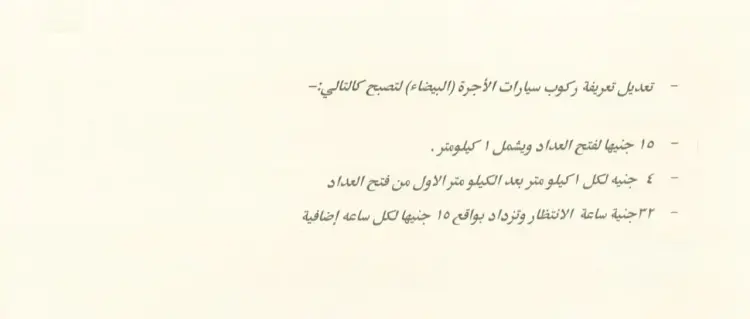 ا لساعة الانتظار، وهي الأسعار المعمول بها بعد آخر تعديل في أجرة سيارات الأجرة.