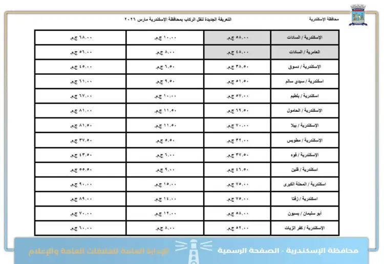 يتشر شبابيك تعريفة الركوب الجديدة بالإسكندرية بعد زيادة مارس 2026 لجميع الأماكن المختلفة سواء داخليا أو خارج المحافظة، حتى يتعرف عليها الركاب تزامنا مع بدء تطبيقها.