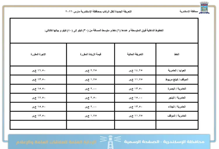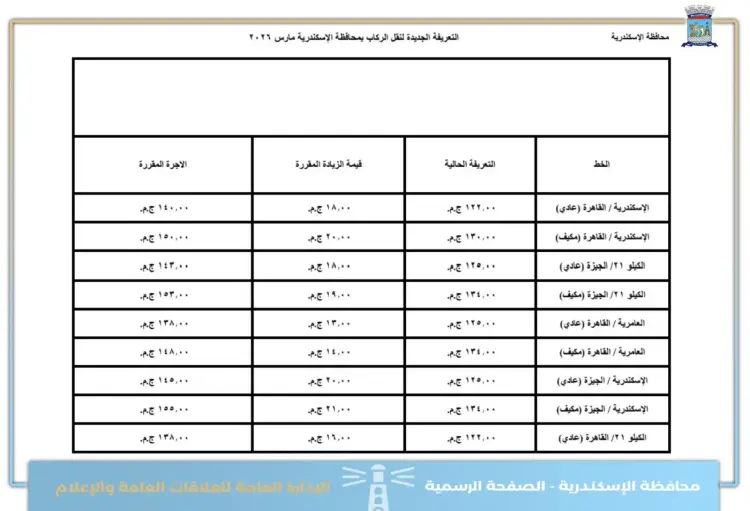 تعريفة الركوب الجديدة بالإسكندرية بعد زيادة مارس 2026 لجميع الأماكن