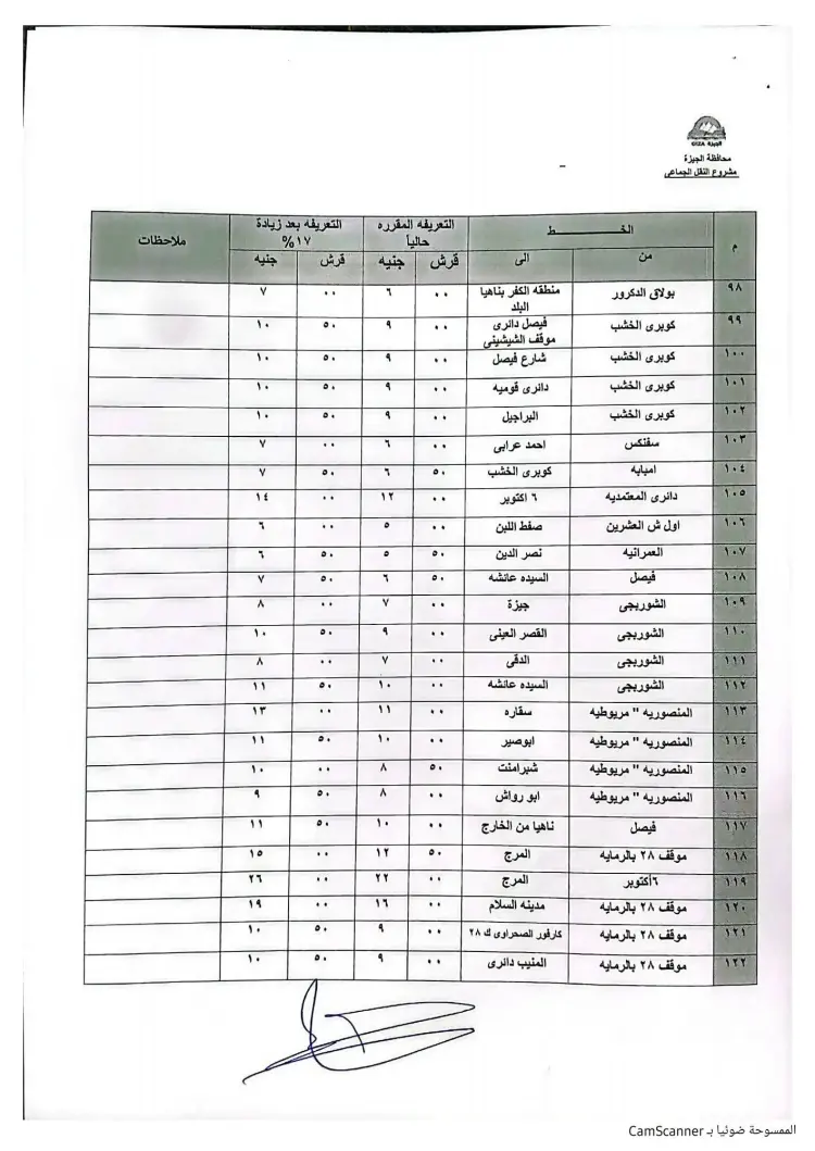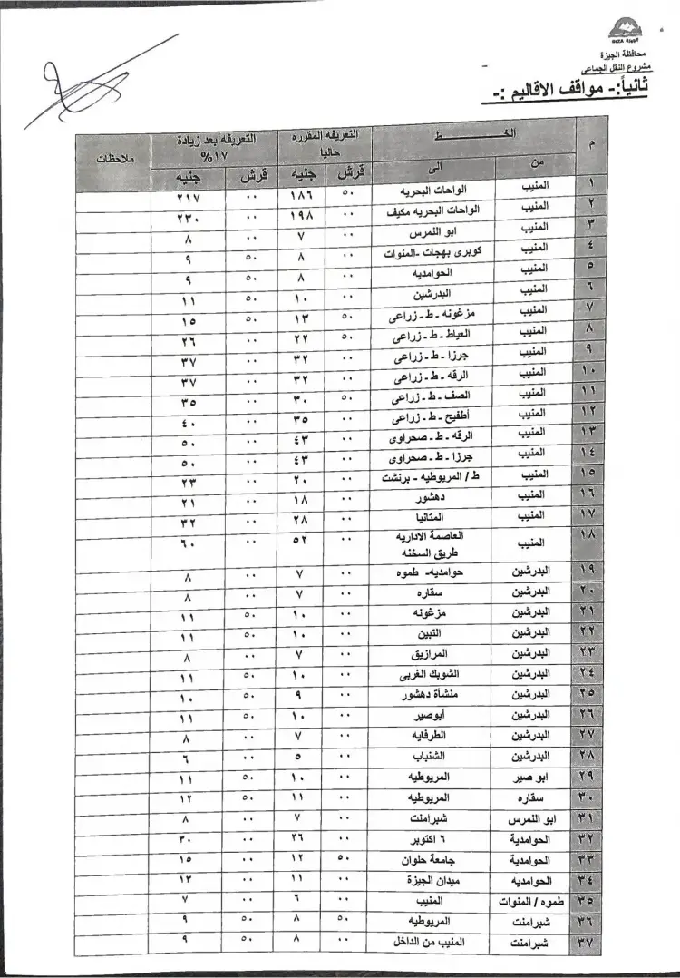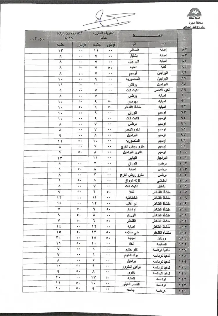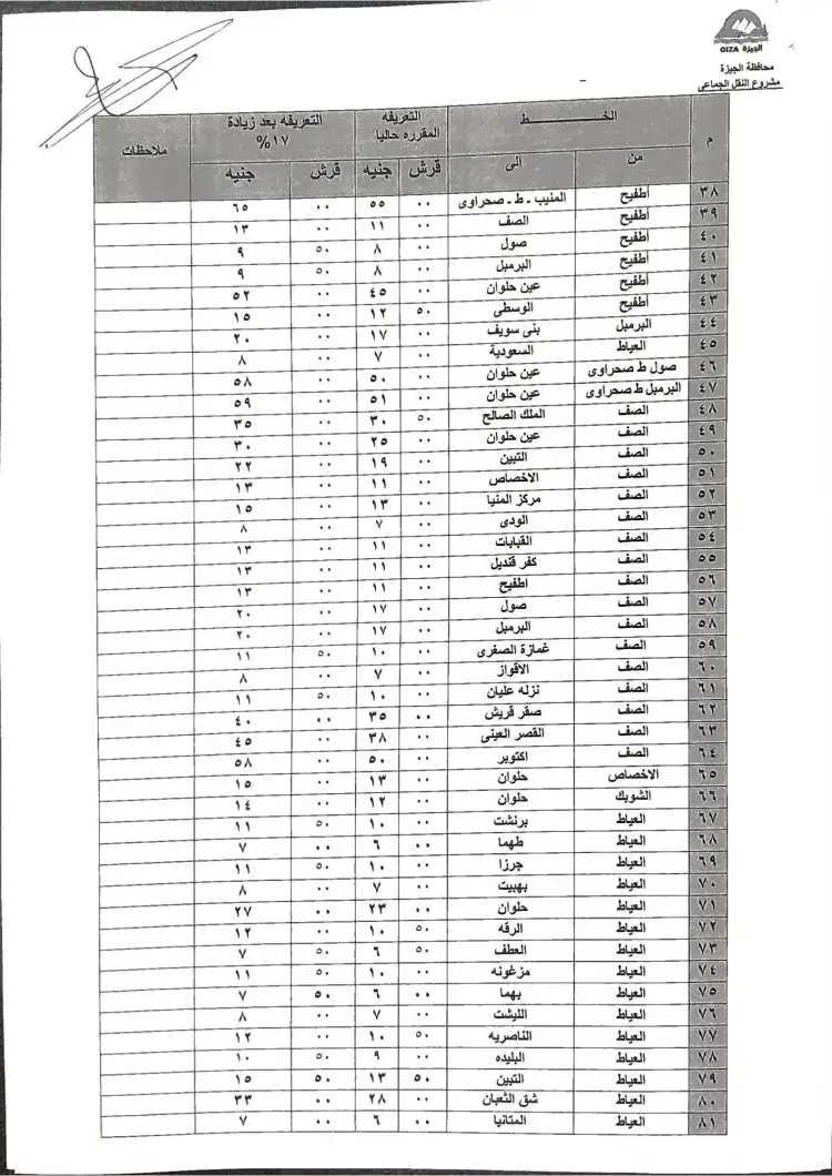 ينشر شبابيك التعريفة الجديدة للمواصلات بالجيزة بعد الزيادة الأخيرة في مارس 2026، ليتعرف جميع الركاب على الأجرة تزامنا مع تطبيق الأسعار الجديدة.