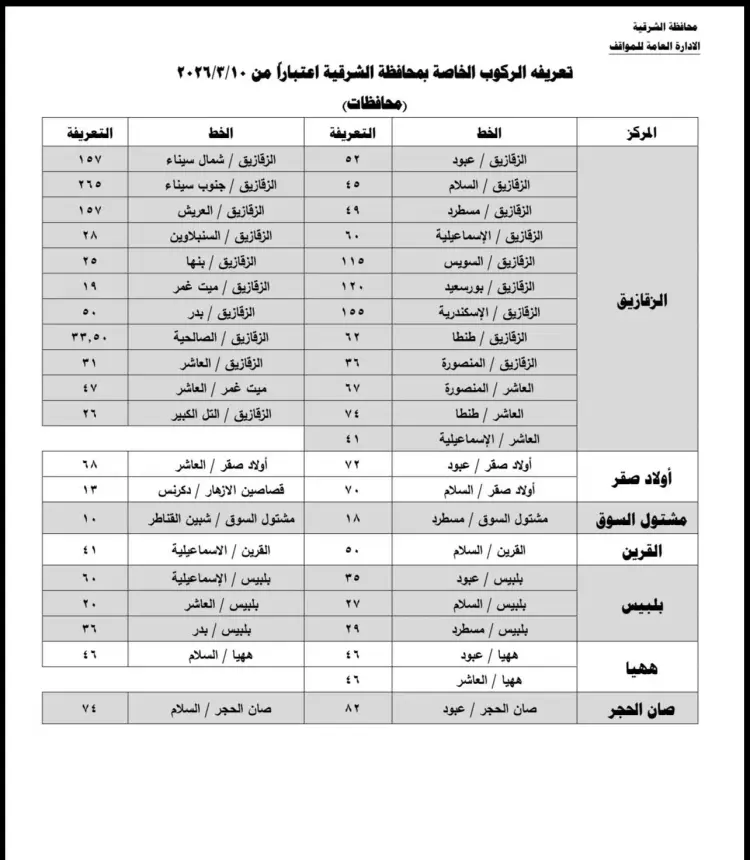 تعريفة المواصلات الجديدة في الشرقية مارس 2026