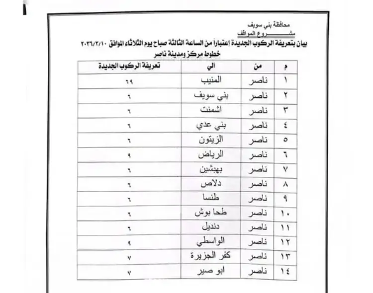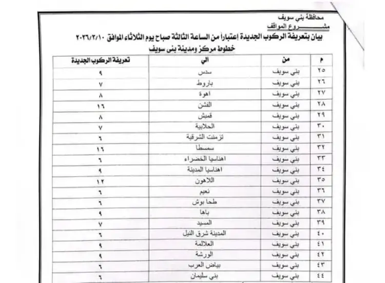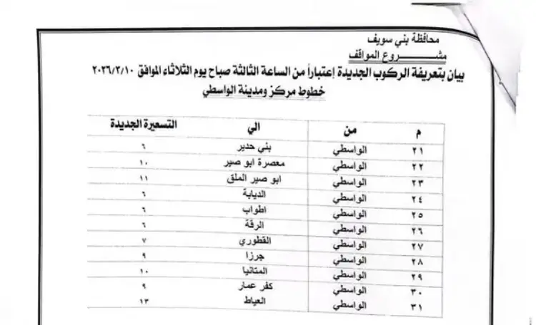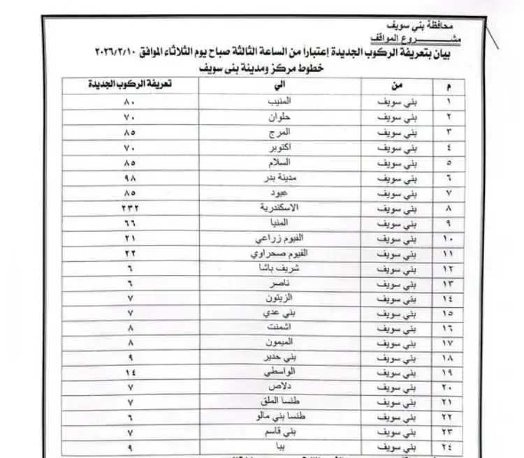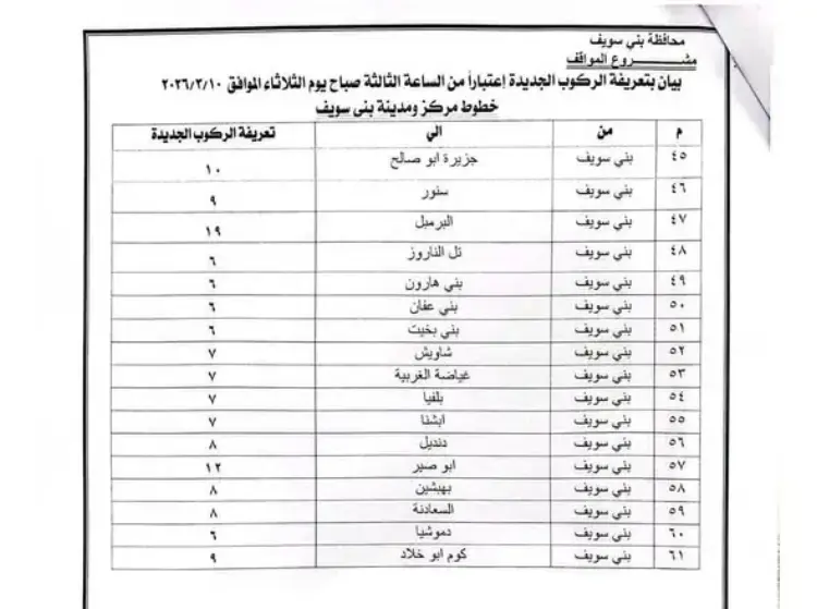 تعريفة مواصلات بني سويف بعد زيادات مارس 2026 (صور)
