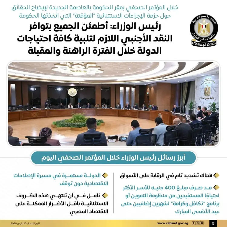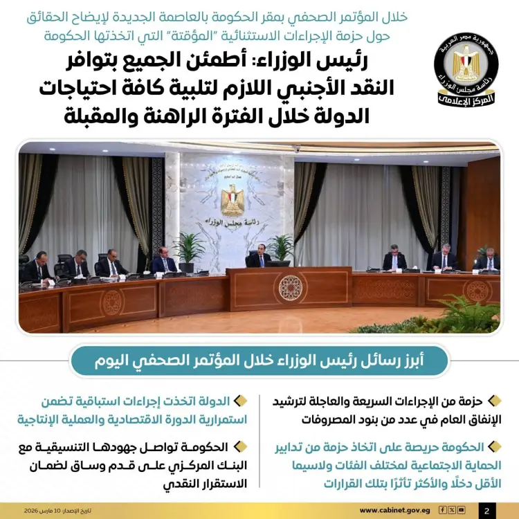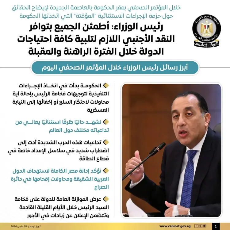 واختتم رئيس الوزراء حديثه بالإشارة إلى أن هذه الإجراءات تعد مؤقتة ومرتبطة بالظرف الاستثنائي الراهن، موضحا أنه ستتم مراجعة كافة هذه القرارات والمدى الزمني لتطبيقها بمجرد انحسار تداعيات الأزمة العسكرية في المنطقة وعودة الاستقرار لأسواق الطاقة العالمية.