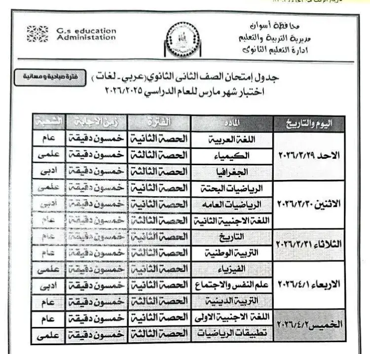 جدول امتحانات شهر مارس للصف الثاني الثانوي 2026 لجميع الشعب بمحافظة أسوان