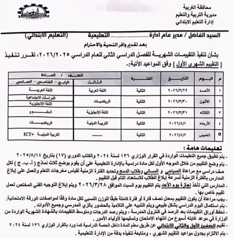 جدول امتحانات شهر مارس 2026 للصفوف الرابع والخامس والسادس الابتدائي محافظة الغربية
