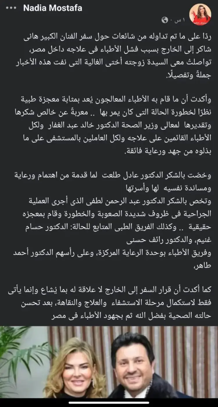 وبينما أشارت التقارير إلى تحسن الحالة الصحية، أكدت نادية مصطفى أن زوجة الفنان أعربت عن تقديرها للدعم النفسي والمهني الذي قدمه الدكتور عادل طلعت لأسرة هاني شاكر طوال فترة تواجده بالمستشفى، مشددة على أن الكوادر الطبية المصرية بذلت جهودا فائقة وفرت الرعاية اللازمة قبل اتخاذ قرار السفر للخارج الذي يأتي كإجراء تكميلي لا علاقة له بجودة العلاج المقدم في القاهرة.