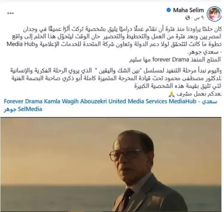أطلقت المنتجة مها سليم البرومو التشويقي الأول لمسلسل بين الشك واليقين، والذي يوثق الرحلة الفكرية والإنسانية العميقة للدكتور الراحل مصطفى محمود.
