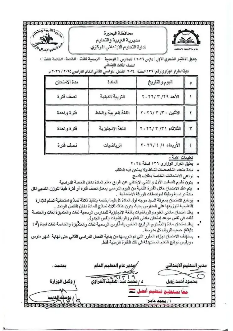 جدول امتحانات شهر مارس 2026 لطلاب الثالث الابتدائي محافظة البحيرة