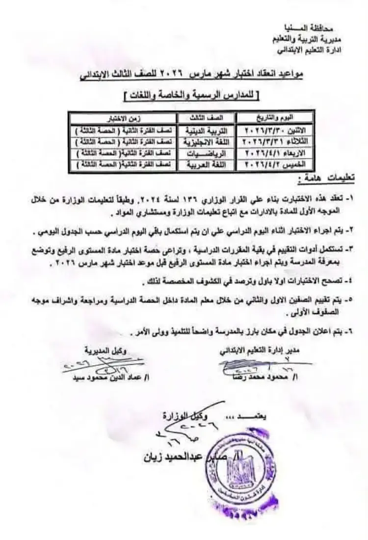 كشفت مديرية التربية والتعليم بمحافظة المنيا، ممثلة في إدارة التعليم الابتدائي، عن المواعيد الرسمية لانعقاد اختبار شهر مارس لعام 2026 لطلاب الصف الثالث الابتدائي، حيث تشمل الجداول المعلنة طلاب المدارس الرسمية والخاصة واللغات بكافة الإدارات التعليمية التابعة للمحافظة، وتأتي هذه الاختبارات استنادا إلى القرار الوزاري رقم 136 لسنة 2024، مع الالتزام بتعليمات وزارة التربية والتعليم ومستشاري المواد الدراسية لضمان دقة العملية التقييمية ومناسبتها للمرحلة العمرية للطلاب.