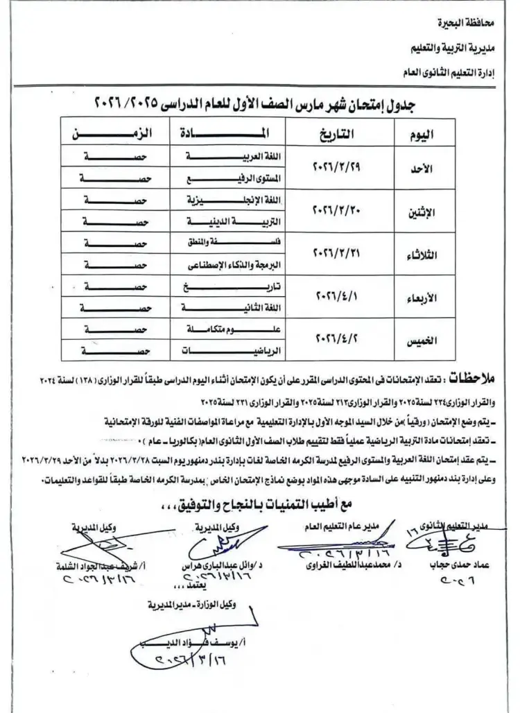 جدول امتحانات أولى ثانوي شهر مارس 2026 محافظة البحيرة