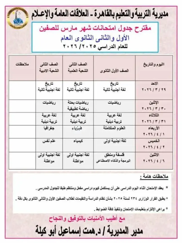 جدول امتحانات شهر مارس 2026 للصفين أولى وثانية ثانوي بالقاهرة