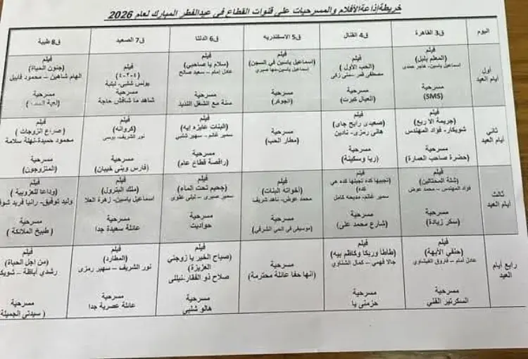 تستعد القنوات الإقليمية التابعة لقطاع القنوات المتخصصة بالهيئة الوطنية للإعلام، لتقديم وجبة ترفيهية لجمهورها خلال أيام عيد الفطر المبارك لعام 2026؛ حيث أعلنت الخريطة البرامجية عن عرض باقة من أمتع الأفلام الكوميدية والمسرحيات الكلاسيكية التي ارتبط بها الوجدان المصري.