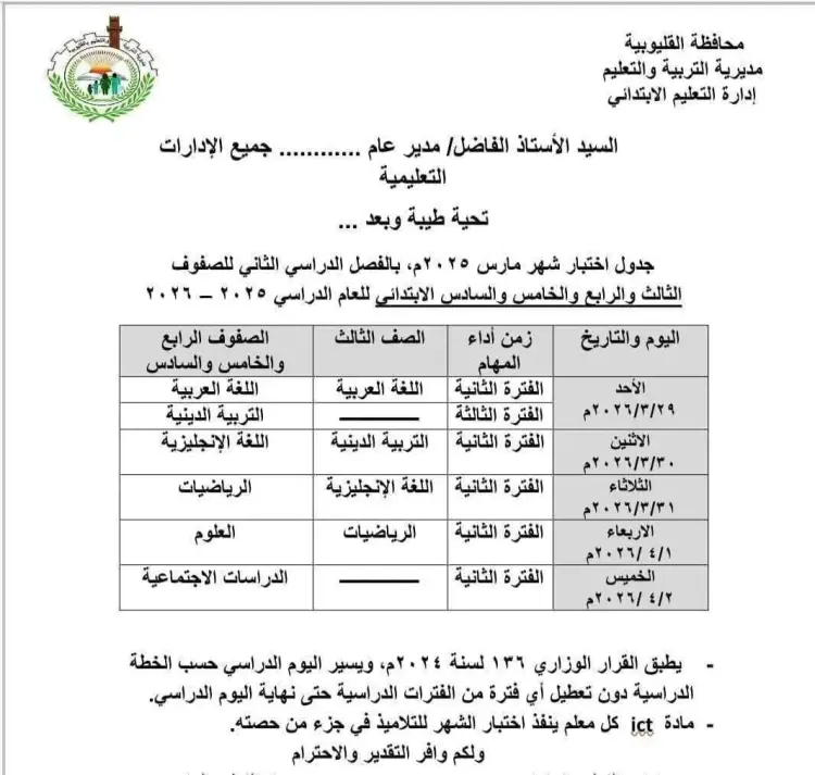 جدول امتحانات شهر مارس رابعة ابتدائي محافظة القليوبية 2026