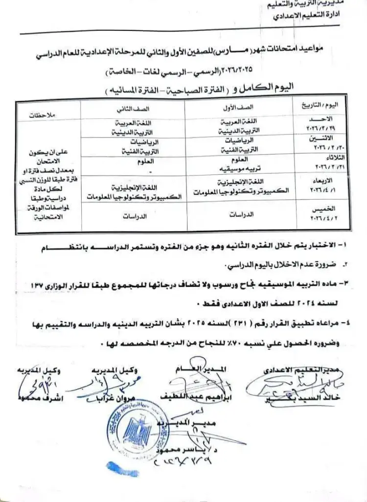 جدول امتحانات شهر مارس الصف الأول الإعدادي محافظة القليوبية 2026