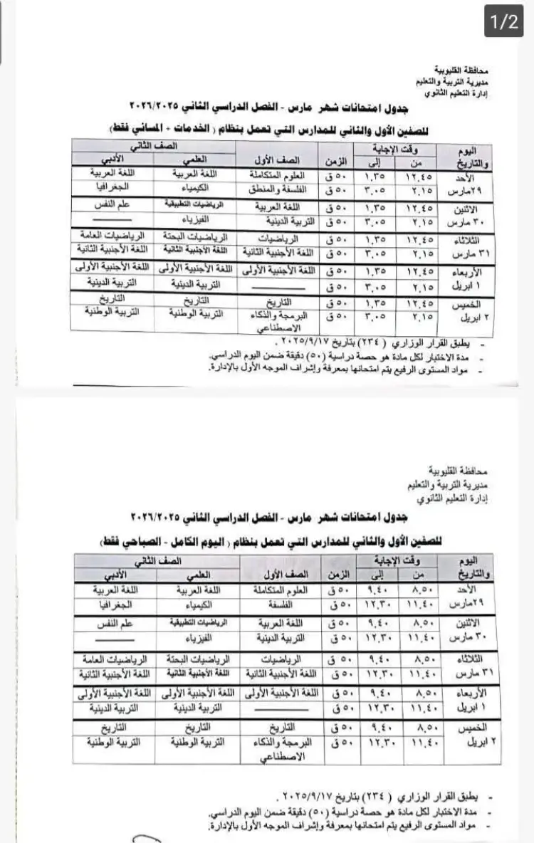 جدول امتحانات شهر مارس أولى ثانوي محافظة القليوبية 2026