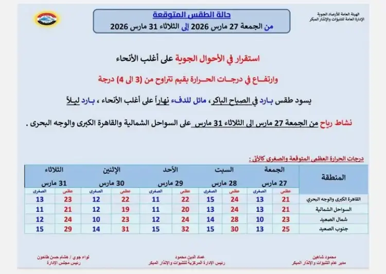 أعلنت الهيئة العامة للأرصاد الجوية عن استقرار ملحوظ في طقس الأسبوع المقبل على أغلب أنحاء الجمهورية، وذلك في بيان رسمي كشف عن تحول مفاجئ في الأحوال الجوية يبدأ من يوم الجمعة 27 مارس ويستمر حتى الثلاثاء 31 مارس 2026، حيث توقعت الهيئة ارتفاعا تدريجيا في درجات الحرارة بقيم تتراوح ما بين 3 إلى 4 درجات مئوية مقارنة بمعدلات الأسبوع الجاري.