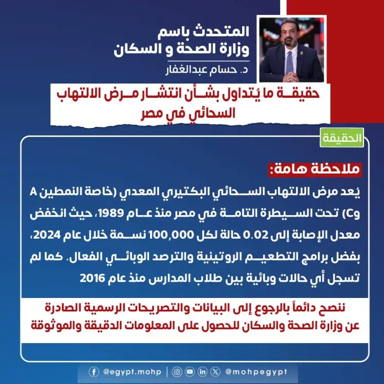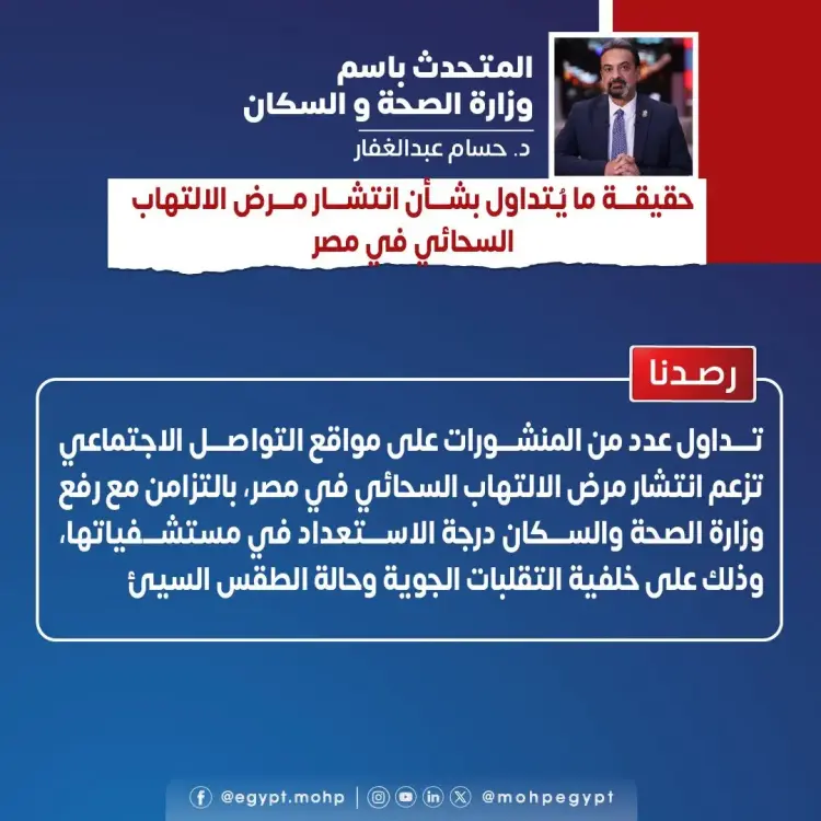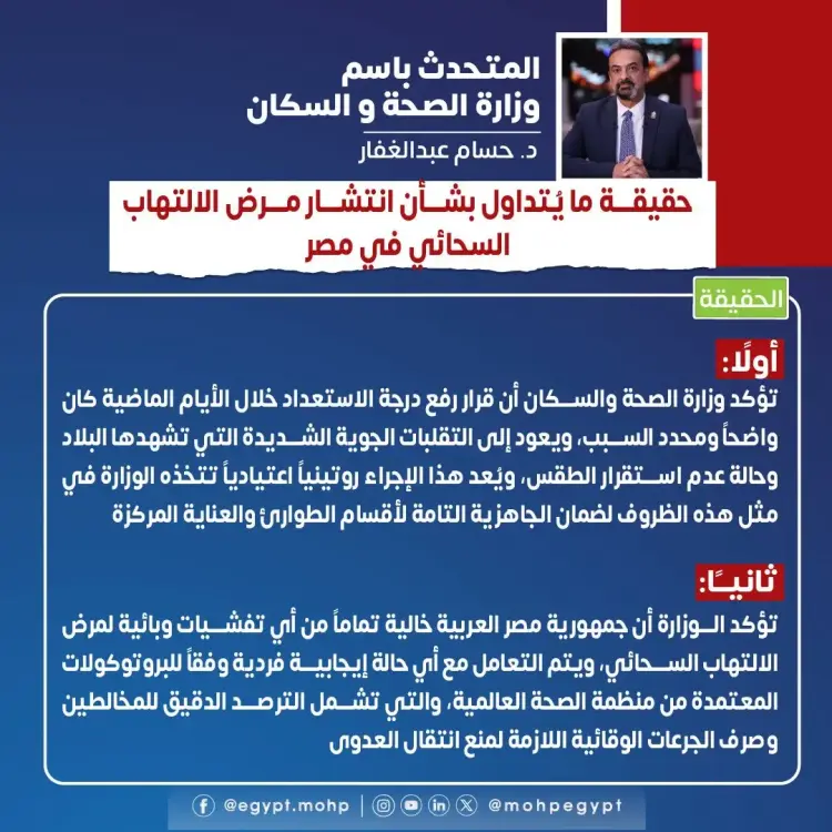 أكد المتحدث بإسم وزارة الصحة والسكان أن هذه الأنباء عارية تماما من الصحة، ولا تستند إلى أي بيانات رسمية أو مؤشرات وبائية حقيقية.
